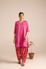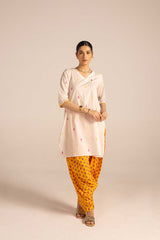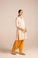 A classic-fit embroidered textured kurta featuring a V-neckline. The kurta is adorned with delicate embroidered motifs throughout, adding intricate charm. Paired with contrast-printed cowled shalwar, this ensemble offers a perfect blend of elegance and modern style.