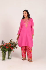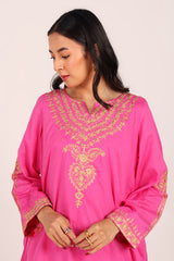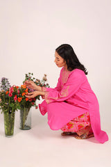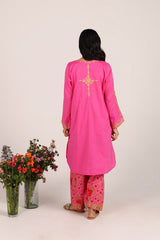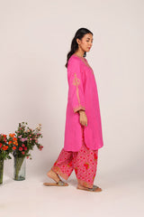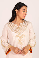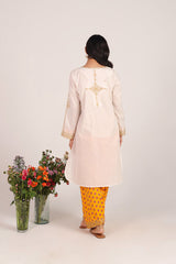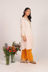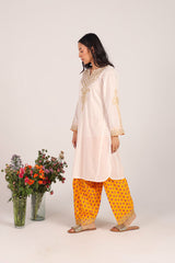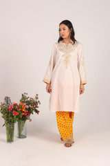 A classic-fit embroidered kurta on a speckled base, featuring a round neckline with a V-slit. The neckline is adorned with delicate tilla embroidery and paisley patterns. The sleeves and back are enhanced with the same intricate embroidery. Paired with a contrast-printed classic-fit shalwar, finished with embroidery at the ankle hemline.
