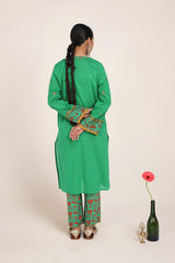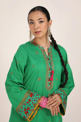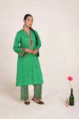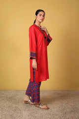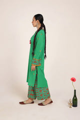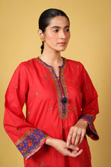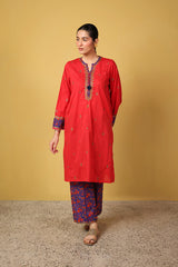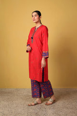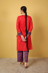 A classic fit embroidered kurta features a round neckline with a V-slit, adorned with colorful tassels and button details on the floral placket. Gold embroidered motifs accentuate the kurta, while the sleeve hems are delicately embellished with gold embroidery. Paired with contrast printed culottes, gold details enhance the ankle hemline.