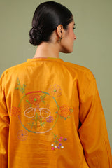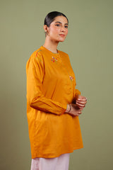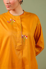 An embroidered top with a round neckline, featuring delicate stitching along the neck, shoulders, and placket. Feminine floral motifs elevate the front, while cuffed sleeves offer a refined finish. Embroidery at the back adds a lively, graceful touch.