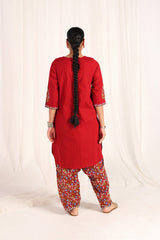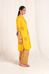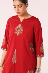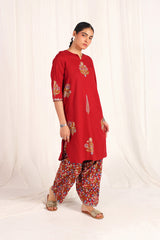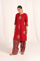 An embroidered classic-fit kurta featuring a round neckline with a V-slit, adorned with delicate aari embroidered motifs all over. The sleeve hems are detailed with matching embroidery. Paired with a vibrant floral printed classic-fit shalwar, finished with embroidered accents at the ankle hemline.