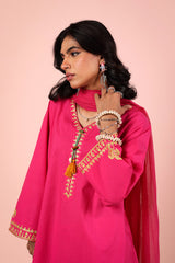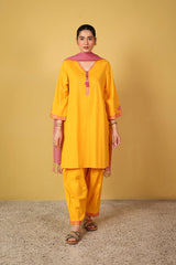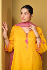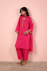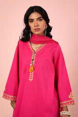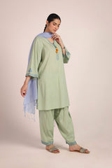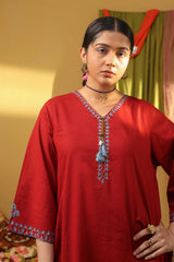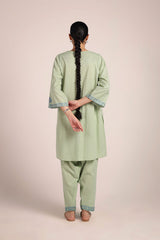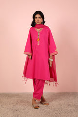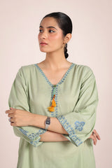 A classic fit embroidered kurta with a V-neckline. The neckline and front placket are embellished with delicate, vibrant embroidery, enhanced with playful tassel details. The sleeve hems are also adorned with colorful embroidered accents. Paired with solid-hued classic fit shalwar featuring embroidery on the ankle.