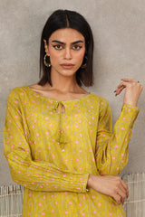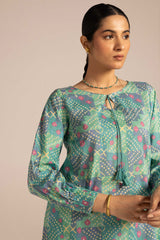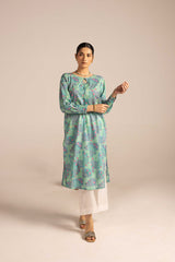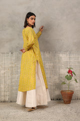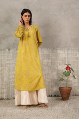 An easy-fit, flared printed kurta featuring a round neckline with a keyhole detail. The neckline is adorned with delicate mukesh work and tassels, while subtle pleats and mukesh accents on the sleeve hems add charm. Pair with any Gen bottoms for a complete look.