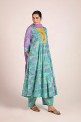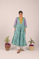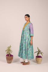 A relaxed-fit, long flared frock with a round neckline and V-slit, adorned with buttons and playful tassel detailing. The pastel chunari prints lend a soft, stylish touch, while the gathers around the empire waist create a graceful, dancing flare to the silhouette. It can be paired with any generation bottoms for a versatile look.