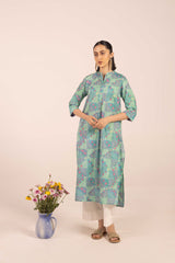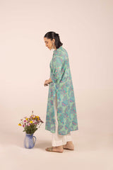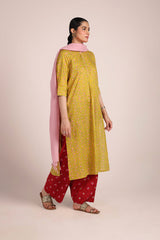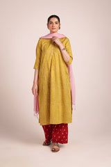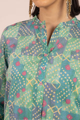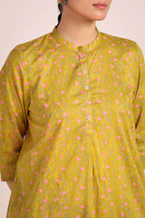 A classic-fit, pastel chunari-printed kurta features a round neckline with a V-slit. The front placket is adorned with floral button details. The chunari print in soft pastel hues adds a sophisticated touch. It can be paired with any generation for a chic look.