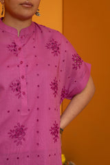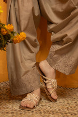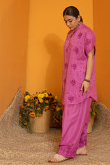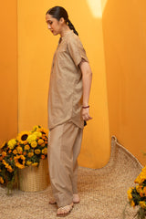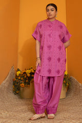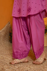 Classic-fit Schiffli shirt with a low band neckline and a buttoned front placket. Designed with subtle batwing shoulders, turn-up sleeve hems, and a rounded shirt hem. Comes with an inner for added comfort. Paired with a khula poncha shalwar, finished with Schiffli detailing along the borders.