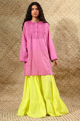 Classic-fit schiffli shirt designed with a round neckline and buttoned placket, adorned with a detailed embroidered front panel. Comes with an inner for added comfort and ease.
