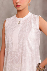 A classic-fit printed shirt featuring a low band neckline with button detailing. Delicate frill accents on the sleeve hems and gentle gathers at the back add a graceful flare to the silhouette.