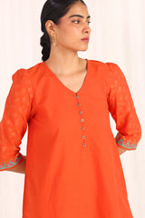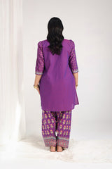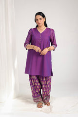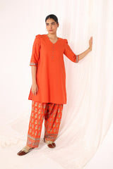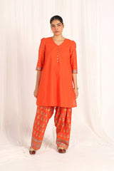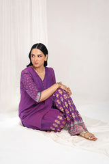 A block-printed flared kurta featuring a V-neckline adorned with buttons along the front placket. The puff sleeves are decorated with floral block-printed details. Paired with matching block-printed khula poncha shalwar for a coordinated and elegant look.