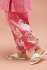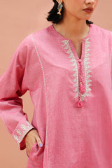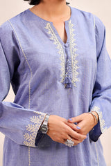 A paneled short kurta featuring a round neckline with a V-slit, adorned with delicate dori embroidery and tassel accents. The straight sleeves and shirt front are finished with dori embroidery detailing, along with side pockets for added ease. Paired with a matching classic-fit shalwar featured block printed motifs and dori embroidery details on the shalwar hem.
