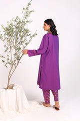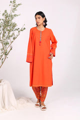 A hand block-printed shirt featuring a round neckline and a printed front placket, enhanced with tassel detailing. The sleeves showcase matching block-printed patterns, perfectly paired with a classic-fit matching printed shalwar for a coordinated and stylish look.
