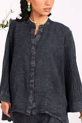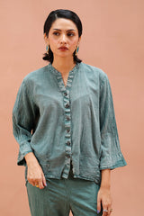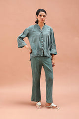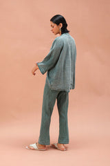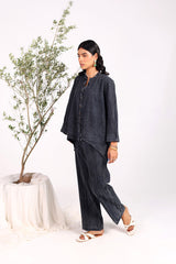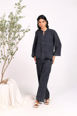 A textured, button-up shirt with a round neckline and a V-slit, finished with button detailing along the front placket. Paired with matching culottes, this co-ord set blends clean tailoring with subtle texture for a chic and effortless everyday look.