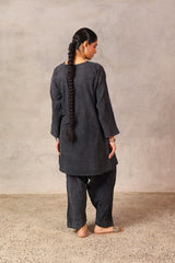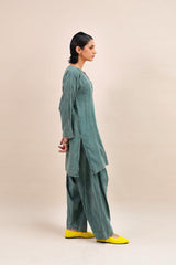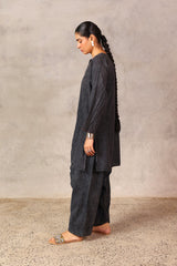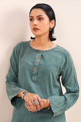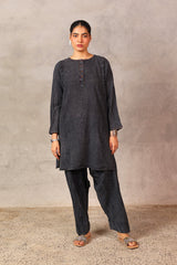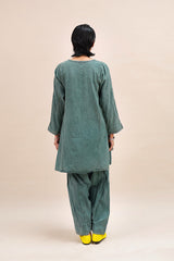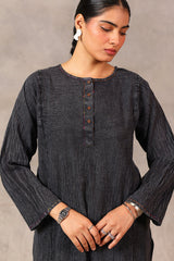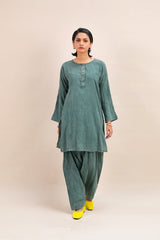 A textured classic-fit panelled kurta featuring a round neckline adorned with vibrant stitching details and buttons on the front placket. The sleeve hems echo the same colorful stitching. Paired with a matching classic-fit shalwar for a cohesive look.