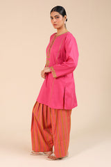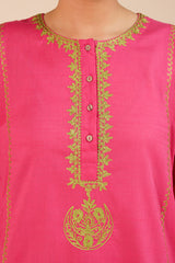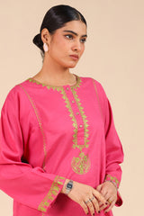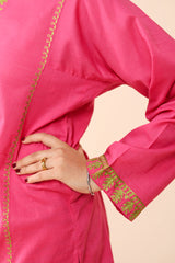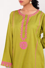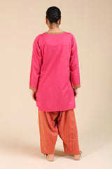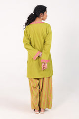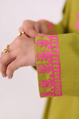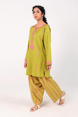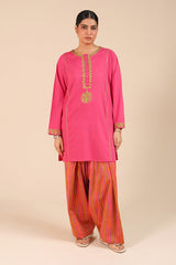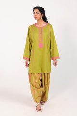 An embroidered paneled shirt with a round neckline and button detailing along the front placket, finished with delicate embroidery. Paired with a khula poncha shalwar.