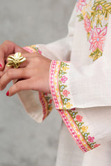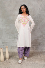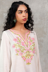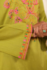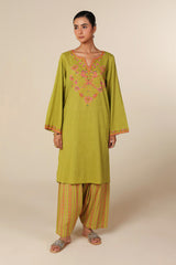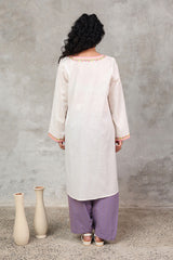 A classic-fit embroidered shirt with a round neckline and V-slit, adorned with delicate embroidery on the bodice and sleeve hems. Paired with a classic-fit shalwar for a graceful look.
