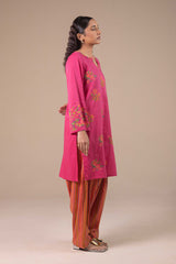 A classic-fit embroidered shirt with a round neckline and a subtle V-cut, adorned with vibrant embroidery throughout. Paired with a classic-fit shalwar for a coordinated and stylish look.