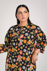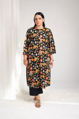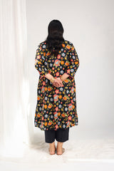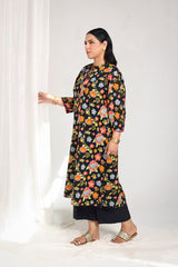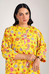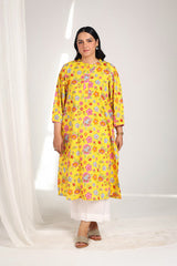 A vibrant classic-fit Phool Bahar printed kurta featuring a band neckline, adorned with delicate lace trim along the front placket. The lively floral print brings the design to life, while the sleeve hems echo the same lace detailing. Can be paired with any Generation bottoms for a complete look.