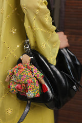 Thoughtfully crafted from surplus fabric, this playful doll wears a classic GEN outfit, with beaded accessories and matching polymer clay shoes. Her hair is crafted into braids using textured yarn and accessorized with colorful tassels. Comes with a keyring for easy use. Every piece is unique and slightly different from the others.
