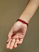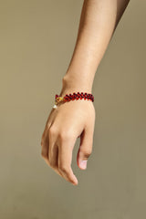 Hand beaded bracelet finished with a lobster clip and pearl charm.