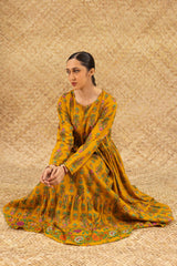 Printed long flared tiered dress with a round neckline, finished with tassel detailing. Soft gathers add a graceful, dancing flare to the silhouette.