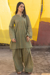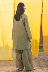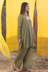Floral-printed classic-fit shirt, enriched with soft fringe accents along the neckline and sleeve hems. Paired with a matching printed farshi shalwar for a refined finish.