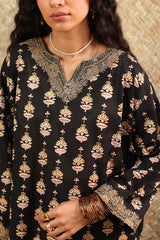 Classic-fit printed shirt with a round neckline and V-slit, finished with delicate embroidery along neckline and sleeve hems. Paired with a coordinated printed gharara.