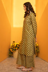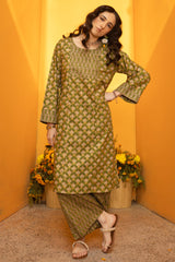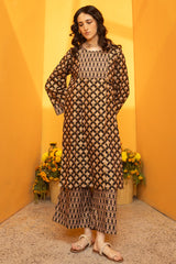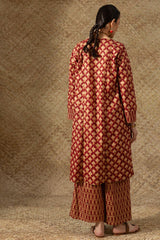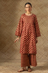 Paneled printed classic-fit shirt with a round neckline, adorned with delicate mukaish detailing on the bodice. Paired with coordinated printed culottes.