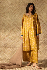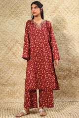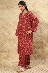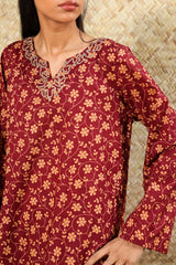 Printed classic-fit shirt with a round neckline and V-slit, adorned with delicate embroidered detailing. Paired with matching printed culottes.