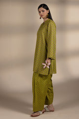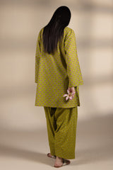 Classic-fit printed shirt with a round neckline and V-slit, adorned with delicate pleat detailing along front placket. Paired with a coordinated printed farshi shalwar, finished with stitching accents along the hemline.