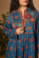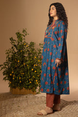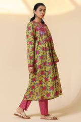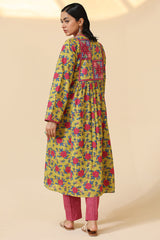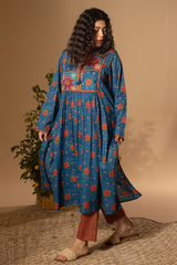 Printed flared shirt with a low band neckline and tassel detailing along the front placket. Soft gathers at the bodice enhance the flared silhouette. Paired with coordinated printed straight-fit trousers.
