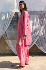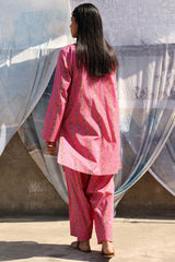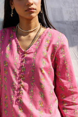 Classic-fit printed shirt with a V-neckline and loop buttons along the front slit. Finished with a round hem. Paired with matching printed farshi shalwar.