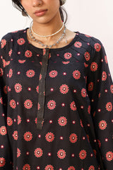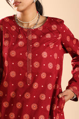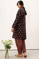 Printed classic-fit shirt with a round neckline, adorned with delicate stitching along the placket and sleeve hems. Paired with coordinated printed classic-fit shalwar.