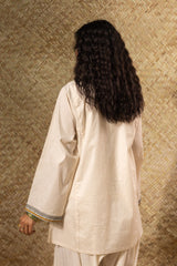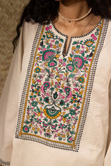 Soft embroidered paneled kurti designed in a relaxed silhouette, adorned with vibrant floral embroidery. Finished with wide sleeves detailed in coordinating embroidered borders. Style it with your preferred Generation bottoms.