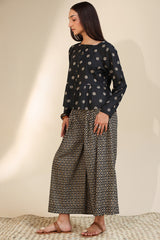 Classic-fit printed peplum top with a square neckline and button detailing along the front placket. Gathers add a soft flare to the silhouette. Paired with coordinated printed flared pleated trousers.