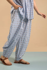 Classic-fit printed gathered shirt with a yoke v neckline, featuring soft gathers around the empire waist for a flared silhouette. Paired with a matching printed balloon shalwar with side pockets.