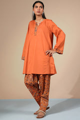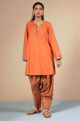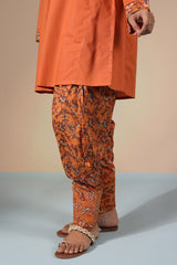 Classic-fit paneled shirt adorned with printed overlay placket and printed sleeve hems, designed in a relaxed silhouette. Paired with coordinated printed pegged shalwar finished with stitching detail.