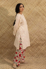 Classic-fit paneled shirt adorned with delicate embroidered detailing along the neckline, buttoned front placket, shoulders, and sleeve hems. Paired with a coordinated printed khula poncha shalwar.