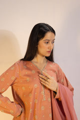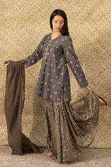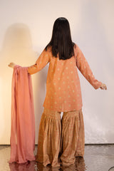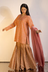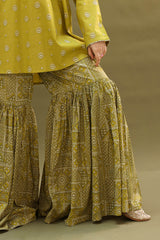 Classic-fit printed shirt with a V-neckline, adorned with delicate gota detailing along the neckline and sleeve hems. Paired with a coordinated printed, generously flared gharara for a refined look.