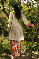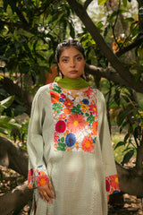 Loose fit kurta, with floral patches on neckline and sleeves, paired with multicolored floral farshi shalwar.