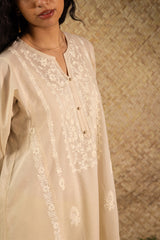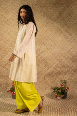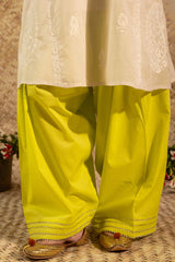 Embroidered paneled kurta crafted on a soft muslin mulmul base, with a round neckline with a V-slit featuring crochet button detailing and coordinating self-embroidery on the sleeves and back panels. Paired with a contrast farshi shalwar with gota lace detailing on the hem. Comes with an inner for added comfort and ease.