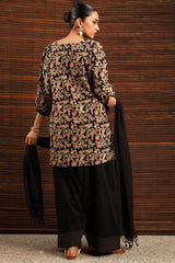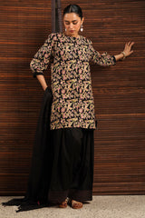 Embroidered classic-fit shirt with a square neckline and subtle puff sleeves, finished with cuffed hems. Detailed with side tassels for added charm. Paired with a classic farshi shalwar featuring stitching detail along the borders. Comes with an inner for added comfort and ease. Styled with a dupatta finished with knotted tassel fringe.