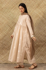 Long flared jacquard shirt designed with a round neckline, enhanced by a curved overlay panel adorned with fabric buttons. Gathers at the empire waist create soft volume and movement. Paired with straight-fit trousers finished with subtle embroidery along the borders.
