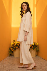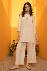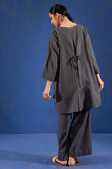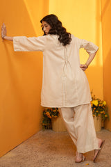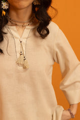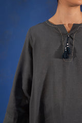 Relaxed-fit shirt adorned with tassel detailing along the placket. Stitch accents highlight the neckline and sleeve hems. Finished with a round hem, while the back features a slit with waist tie-up detailing, adding a soft shape. Paired with matching culottes.
