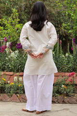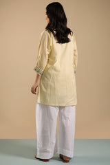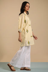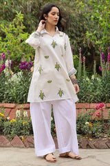 Hand block-printed corn shirt with a collared neckline, adorned with stitching detail. Finished with cuffed sleeve hems. Paired with classic culottes.