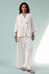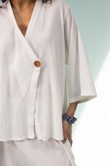 Relax-fit textured co-ord set crafted in a soft, breathable fabric. Designed with an overlap V-neckline secured with a statement button and wide relaxed sleeves. Paired with fluid wide-leg trousers, creating a silhouette that feels both relaxed and refined.