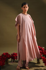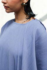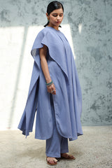 Classic-fit textured shirt with a soft round neckline and hem, layered with a cape-style flared overlay featuring side slit and delicate button detailing. Designed in an airy, fluid silhouette and paired with straight-fit trousers