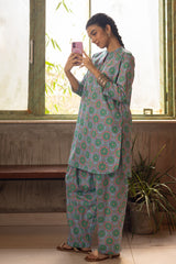 Printed classic-fit shirt with a low band neckline accented with a contrast crochet trim. Subtle pleats enhance the shoulders and the back while the sleeves are finished with minimal ruffle detailing. Paired with a matching printed classic-fit shalwar.