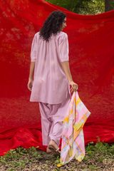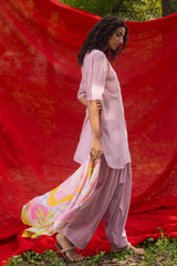 Classic-fit dotted shirt with a low band neckline, with crochet lace detailing and pearl accents along the front slit. Designed with delicate pleats on the shoulders and soft puff sleeves with cuffed hems. Paired with a coordinated khula poncha shalwar. Comes with a printed silk scarf.
