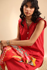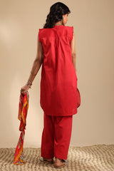 Classic-fit dotted shirt with a low band neckline, with crochet lace detailing and pearl accents along the front slit. Designed with delicate pleats on the shoulders and fringe detailing along sleeve hems. Paired with a coordinated khula poncha shalwar. Comes with a printed silk scarf.