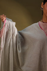 Lightweight yarn-dyed checked dupatta with refined micro-check weave and soft blush stripes, finished with subtle raw fringing.
